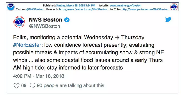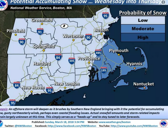 美国国家气象局星期天下午说,它“有信心”一场沿海风暴将影响新英格兰周三晚间到周四白天,尽管该风暴的强度和广度仍不确定。