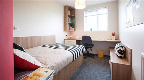 North Lodge提供528张床位,1种房型: En-suite。学生拥有独立卫浴并且共用厨房,根据房间面积和装修,租金也不同。卧室内家具齐全,床、书桌、架子、衣柜。床下可以储物。厨房铺设地板,设施有冰箱、烧水壶,炉灶、橱柜、烤箱、微波炉等。客厅有吧台、沙发和茶几,环境温馨,可以和室友一起在此处休息。公共区域有楼前庭院和公共休闲区,庭院环境优美,有绿植环绕,设有木质桌椅;公共休闲区有沙发、电视 台球、小组讨论学习区。公寓内覆盖WiFi,房租中包含所有费用。